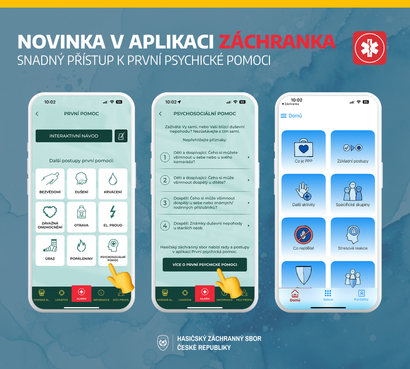 Apikace záchranka nově přidala do svého obsahu odkaz na psychosociální pomoc. Skrz tento odkaz tak přímo odkazuje i na aplikaci První psychická pomoc. Pro region Prahy navíc aplikace nabízí přehled dostupných odborných služeb. Více informací o aplikaci zde: https://www.zachrankaapp.cz/